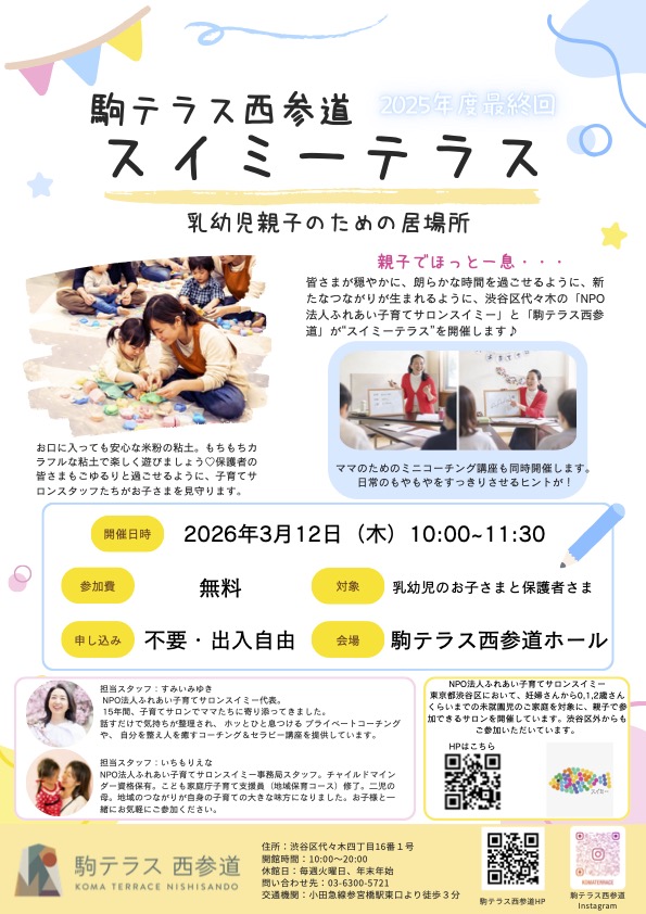 皆さまが穏やかに、朗らかな時間を過ごせるように、新たなつながりが生まれるように、渋谷区代々木の「NPO法人ふれあい子育てサロンスイミー」と「駒テラス西参道」が“スイミーテラス”を開催します♪