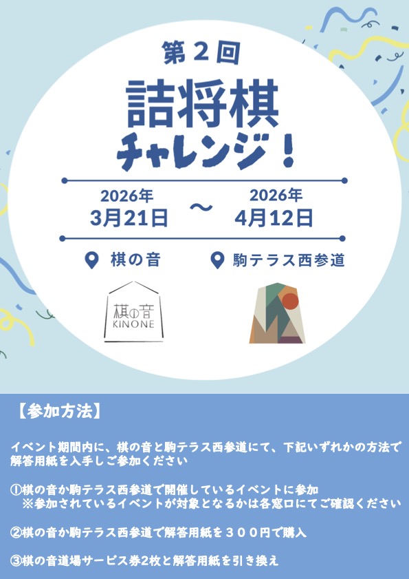 棋の音と駒テラス西参道の連携企画として、「第2回 詰将棋チャレンジ!」を開催いたします。